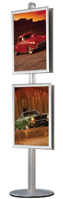 Dupla oldalas display beltéri használatra. A kipattintható keretnek köszöhetően könnyen cserélhetjük poszterünket mindkét oldalon. Kiadványtartó polcokkal kiegészíthetjük a terméket. Domború, szem-magasságban közvetíti a poszterünk üzenetét. |